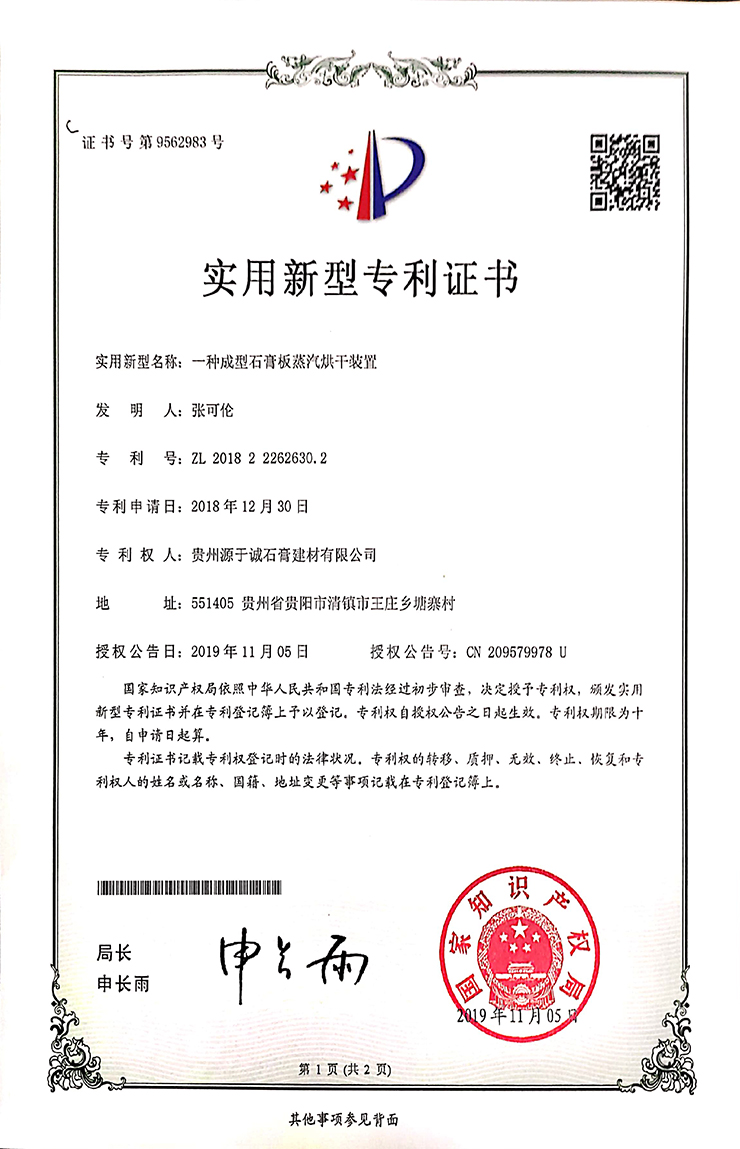 專利證書(一種成型石膏板蒸汽烘干裝置)