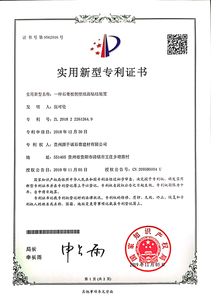 專利證書(一種石膏板側(cè)壁紙面粘結(jié)裝置)